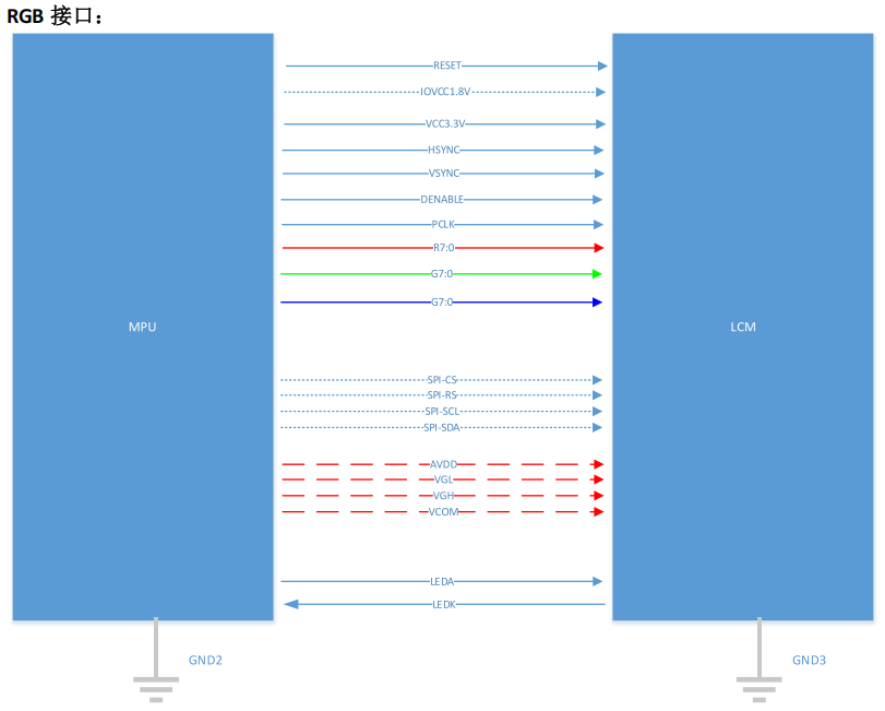 2. ขอบเขตการทำงานที่ชัดเจน: อินเทอร์เฟซ RGB บริสุทธิ์คือ "ช่องข้อมูลการแสดงผลทางเดียว" ความเร็วสูงที่ไม่สามารถส่งคำสั่งเริ่มต้นหรือสถานะการอ่านได้ ดังนั้นในโครงการ LCD แบบกำหนดเอง จึงมักจะทำงานร่วมกับอินเทอร์เฟซการควบคุม เช่น SPI ซึ่งจัดการการเริ่มต้นและการจัดการหน้าจอ