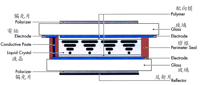 - โครงสร้างหลักของ LCD ประกอบด้วยวัสดุที่เคลือบอย่างแม่นยำหลายชนิด รวมถึงโพลาไรเซอร์ อิเล็กโทรด แผ่นนำไฟฟ้า ผลึกเหลว ฟิล์มปรับตำแหน่ง พื้นผิวแก้ว ซีลขอบ และตัวสะท้อนแสง แต่ละชั้นวัสดุทำหน้าที่เฉพาะ: